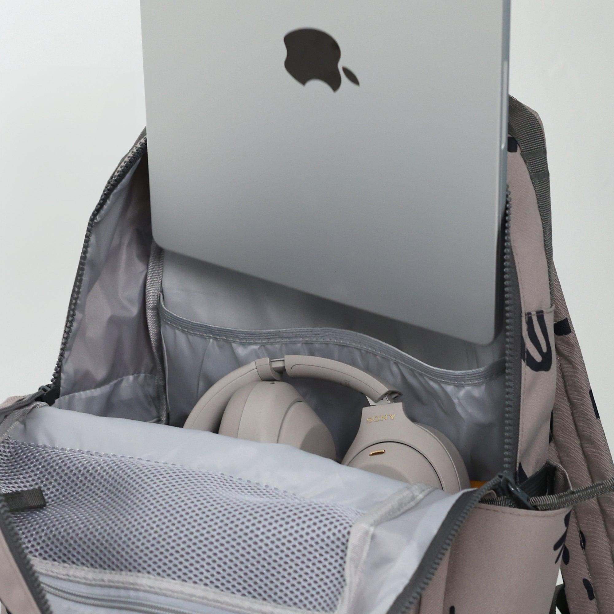 The interior features 4 expanding pockets to organize a variety of items, perfect for bottles and wipes. One large back pocket houses the included changing pad as well as a laptop or tablet up to 16”. The last is a zippered pocket with padded mesh to protect small and delicate items, great for sunglasses.